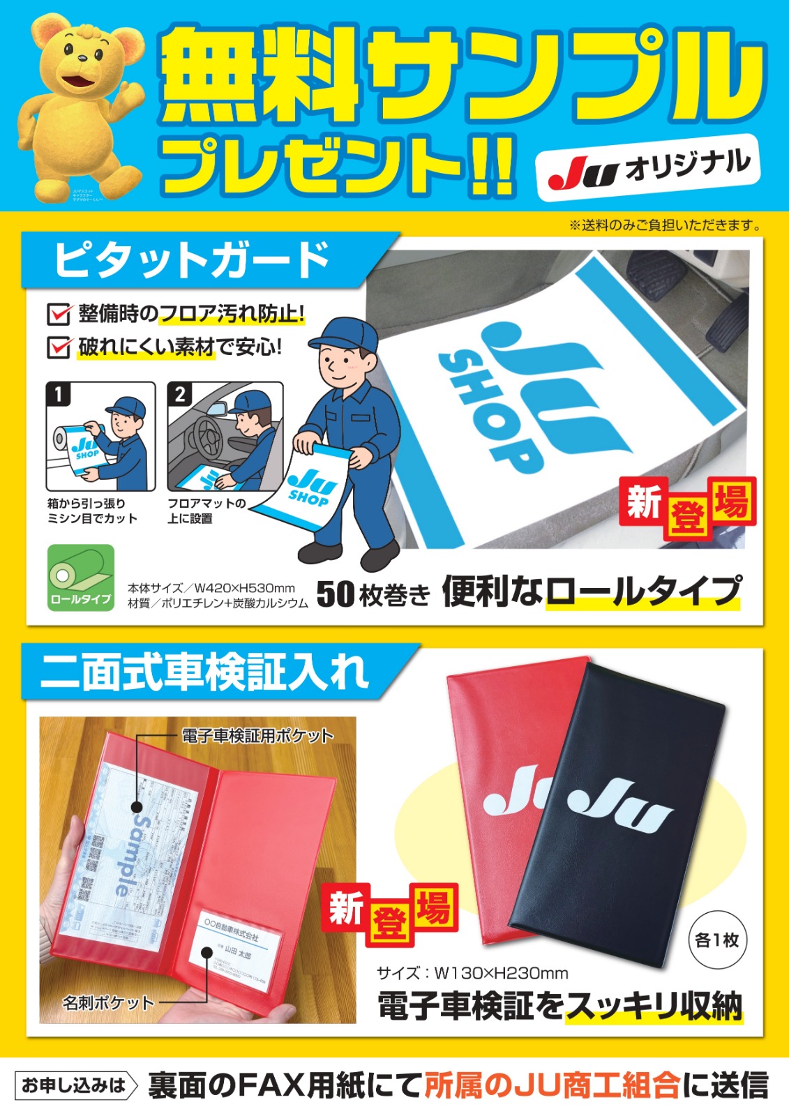 JUオリジナルグッズとして「ピタットガード(マットガード50枚巻き)」「二面式車検証入れ」の無料サンプルを数量限定で希望会員販売店様へ配布することになりました。