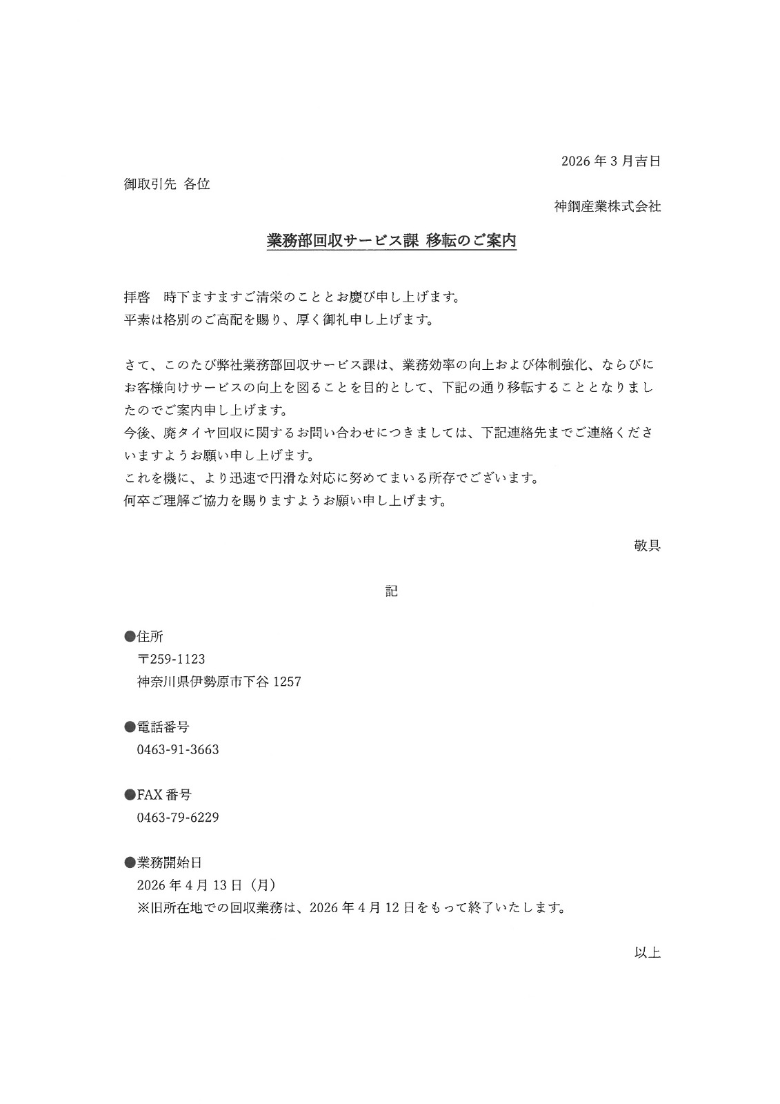 業務部回収サービス課 移転に伴う廃タイヤ回収依頼書変更のお知らせ