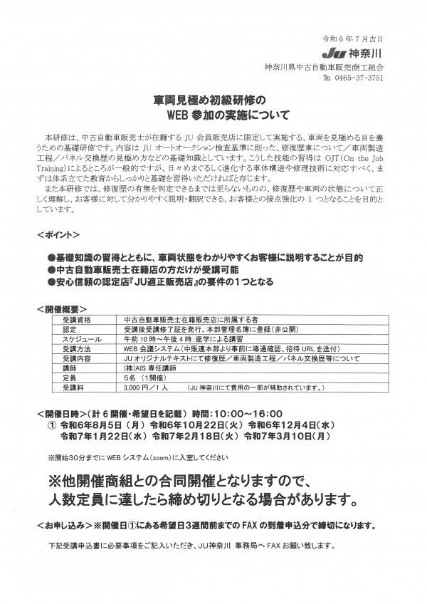 令和6年度 CS基礎研修・車両見極め初級WEB研修を左記の通り開催いたします。